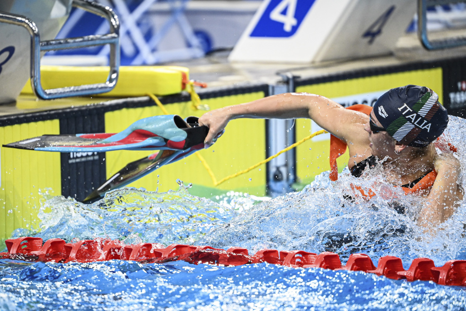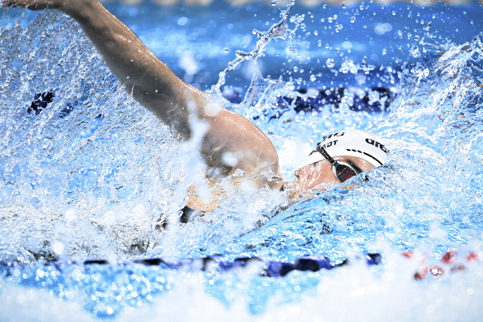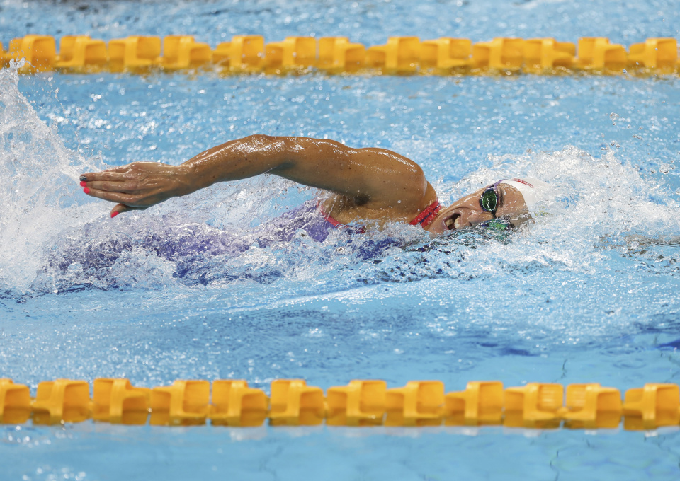 8月8日,意大利选手法布雷蒂(左)在比赛中入水。最终,她获得冠军。新华社记者 江汉 摄